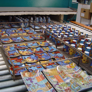 Horno para el tratamiento térmico de cerámica decorativa, con dos zonas de regularización y motorización de temperatura. Movimentación de las bandejas mediante rodillos.